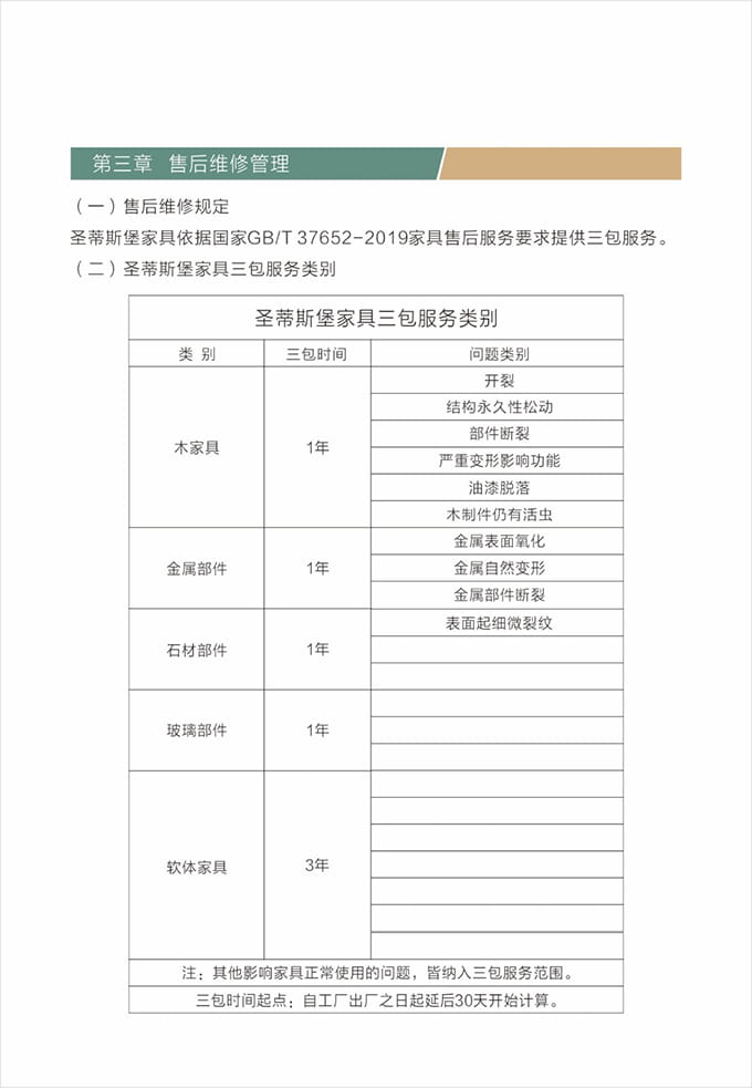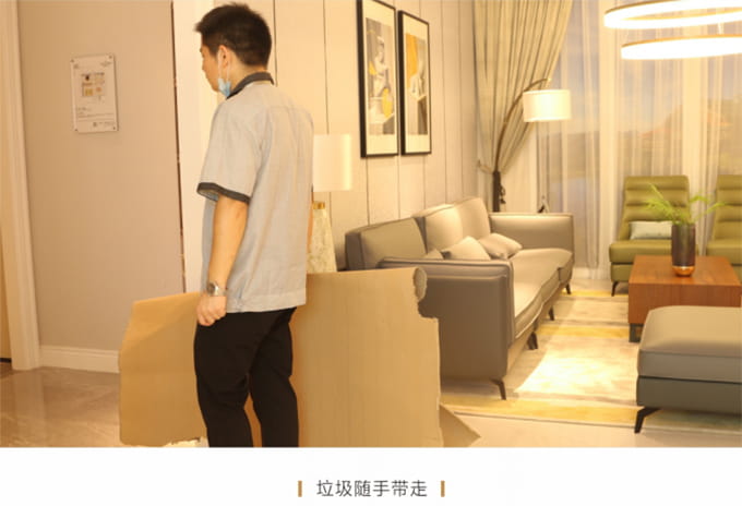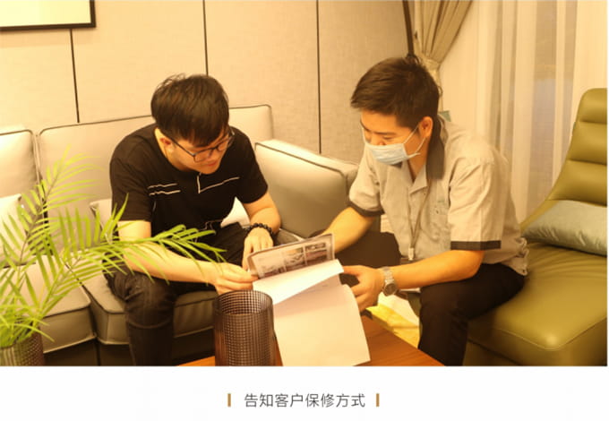 產(chǎn)品處理完畢后必須一站式通檢,指導(dǎo)客戶使用,并將服務(wù)過(guò)程中產(chǎn)生的垃圾隨手帶走,家具維修完畢后,應(yīng)用毛巾將家具擦拭一遍,確保產(chǎn)品清潔。