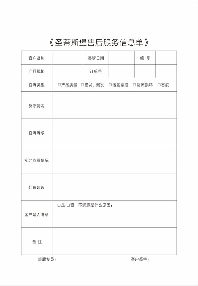 告別之前:告知客戶圣蒂斯堡全國(guó)免費(fèi)服務(wù)電話(售后服務(wù)貼)以及保修方式,請(qǐng)客戶在《產(chǎn)品配送單》上簽名,并填寫《配送滿意度調(diào)查表》后,合影留念。