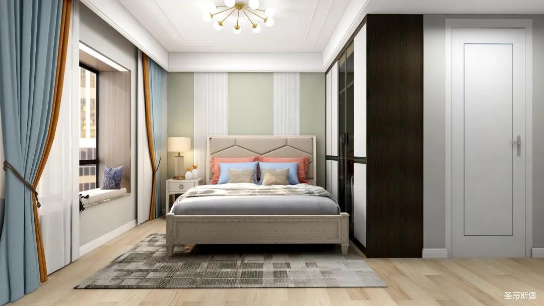 主臥的木飾護(hù)墻配以淺綠與魚(yú)肚白相間,色彩清新自然,層次分明。實(shí)木質(zhì)感與清新色彩,為休憩時(shí)刻注入強(qiáng)烈的氛圍感與隨性感。