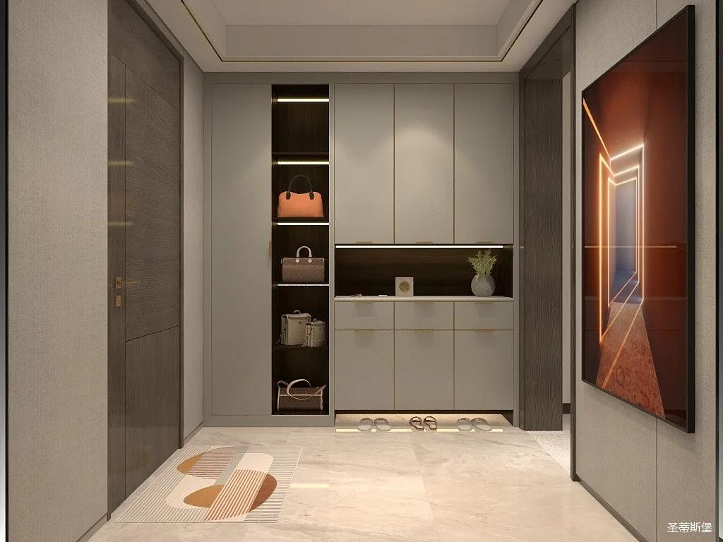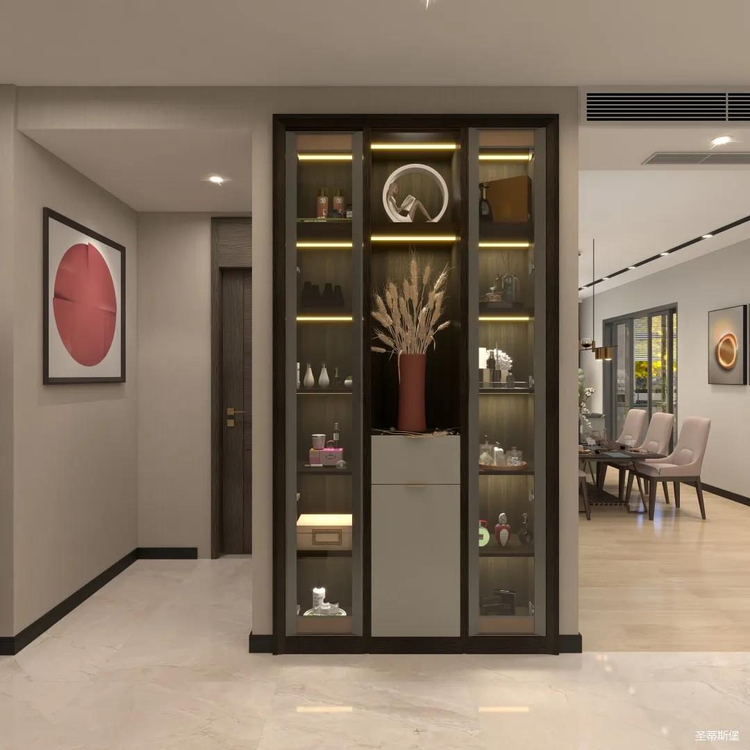 玄關(guān)表達(dá)的不僅僅是藝術(shù)精致,更多是業(yè)主氣質(zhì)的獨(dú)有印記。一邁入空間,便能找到家的歸屬感。玄關(guān)定制柜將最純粹的色調(diào)融入空間,高級(jí)淺灰色系加入淡淡的金屬材質(zhì),提升家的溫馨感,高級(jí)感。入門(mén)處可視儲(chǔ)物區(qū)與隱秘區(qū)域完美劃分,既做到了完美收納又點(diǎn)綴著空間時(shí)尚。