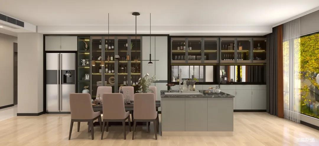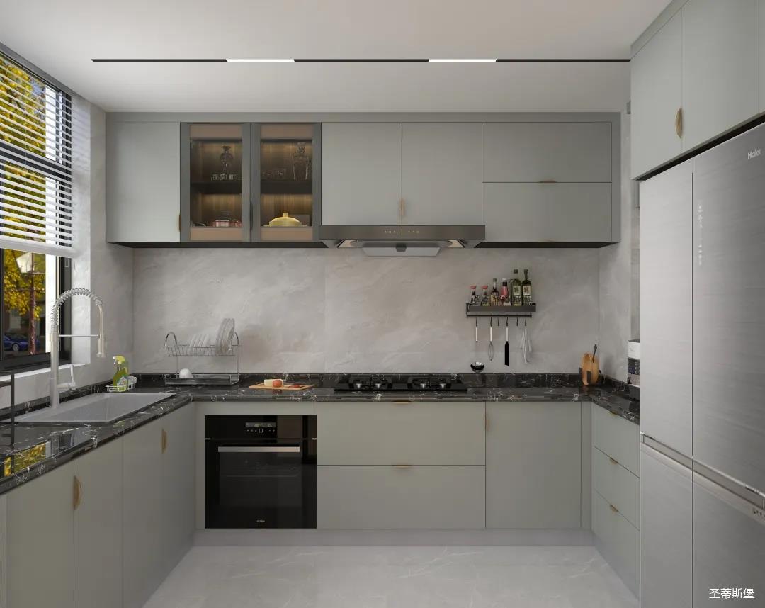 廚房定制設(shè)計(jì)多功能廚柜,搭配防滑地磚,從設(shè)計(jì)造型上摒棄傳統(tǒng)櫥柜的花哨裝飾,色彩搭配簡(jiǎn)約時(shí)尚,人性化功能布局,既有收納區(qū),也有展示區(qū),呈現(xiàn)出利落干凈的秩序?qū)哟危瑵M(mǎn)足空間的儲(chǔ)物需求,也創(chuàng)造了空間規(guī)劃與視覺(jué)美的雙重展現(xiàn)。