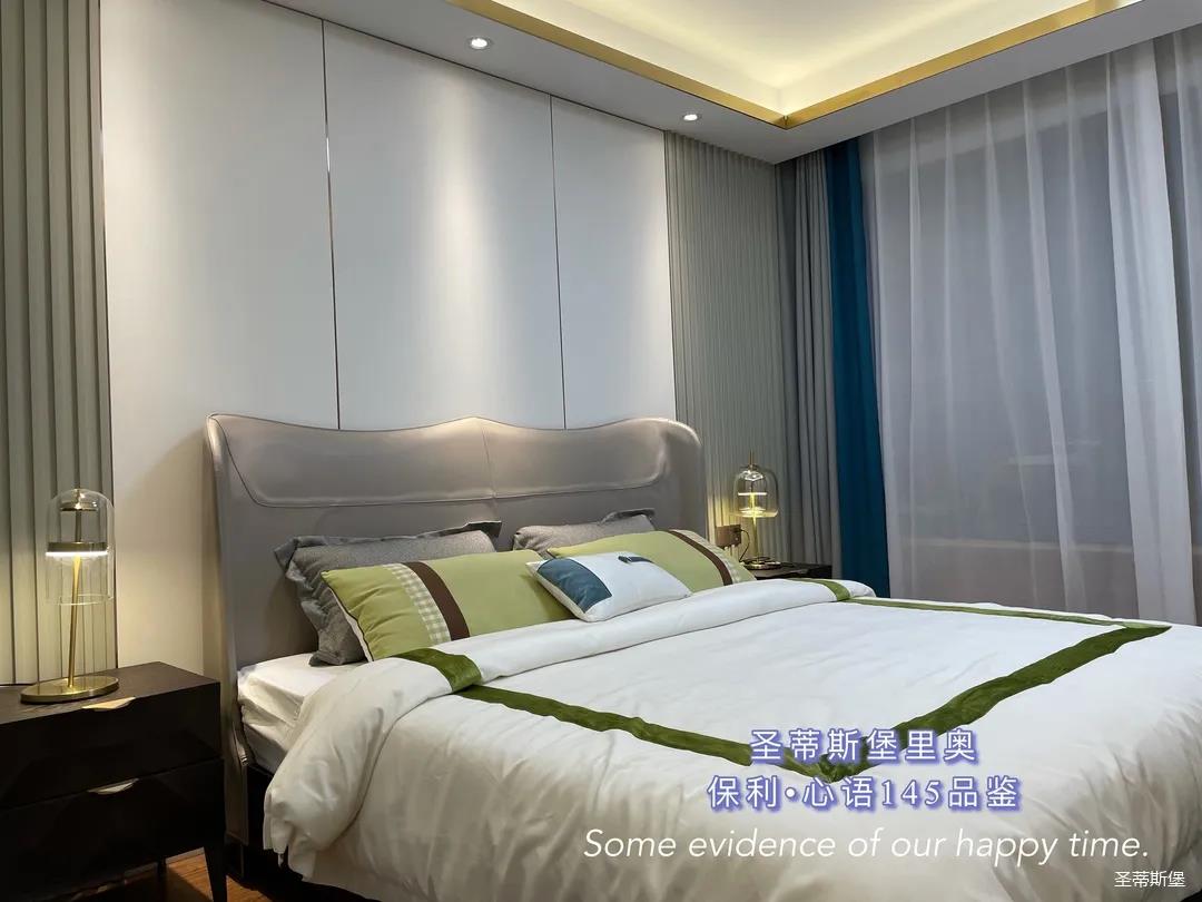 ▲次臥選用拼色,傳達出一種空間平衡美。這里的色彩相比于主臥更加平緩,視覺上也多了份輕巧。床屏與背景飾面組合出疏密有序的線條比例,詮釋著一個精工而不流于艷俗,純凈而不至于過渡簡約的精致臥房。