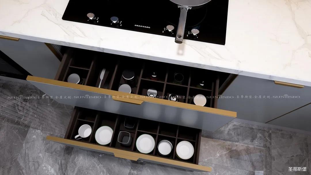 廚房是獨屬我的一片小天地,設(shè)計師充分利用了材質(zhì)特性,定制高柜,根據(jù)我的用廚習(xí)慣進(jìn)行收納區(qū)域劃分,極簡大氣的外部結(jié)構(gòu)實則蘊藏著超乎想象的大收納空間。