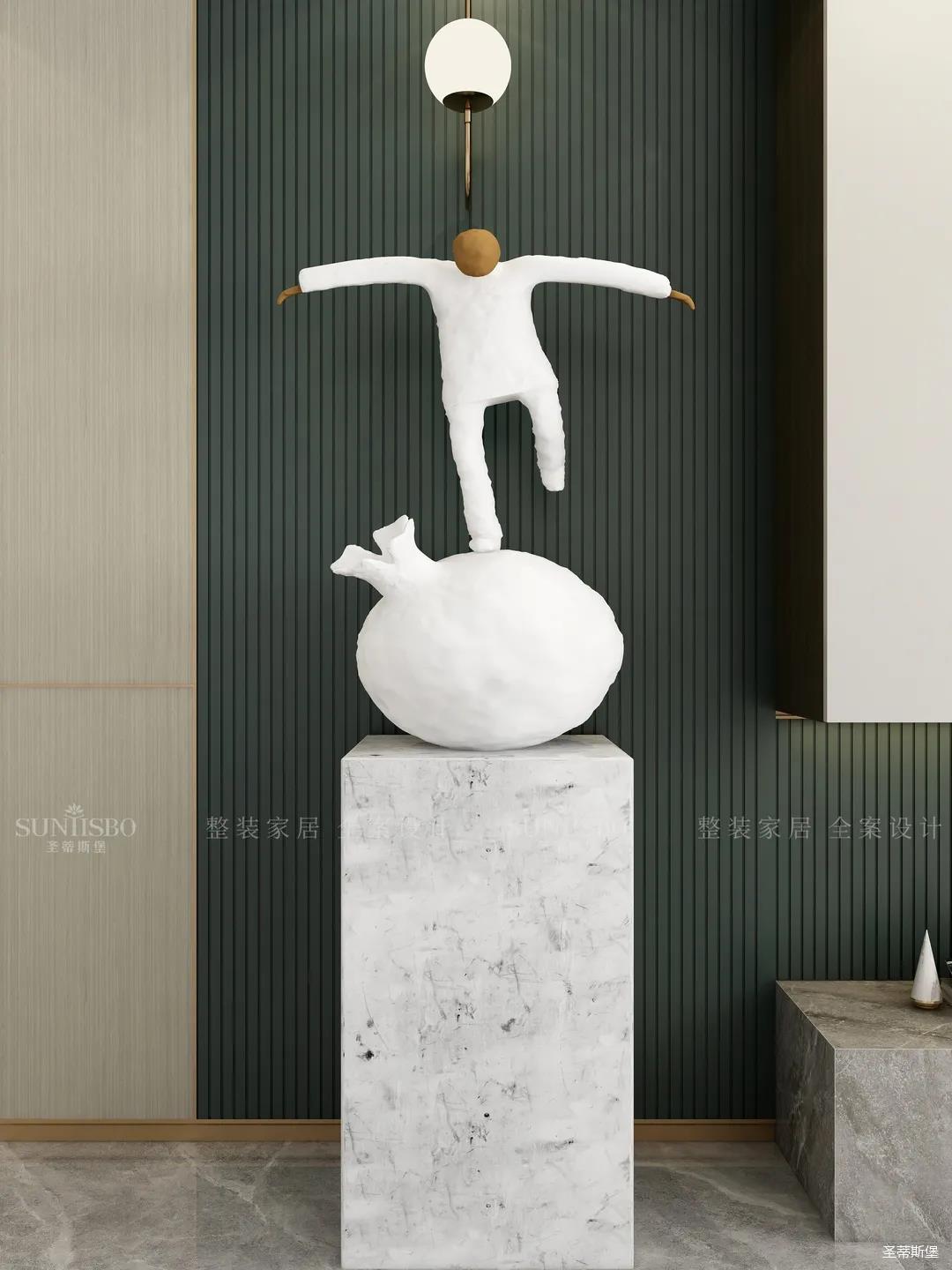 白綠搭配作為當(dāng)下時(shí)尚界的黑馬,一個(gè)沉著冷靜,一個(gè)高級(jí)清新,相互碰撞出前所未有的視覺享受。純白異型藝術(shù)雕塑是室內(nèi)和諧的體現(xiàn),也讓空間洋溢著趣味性。