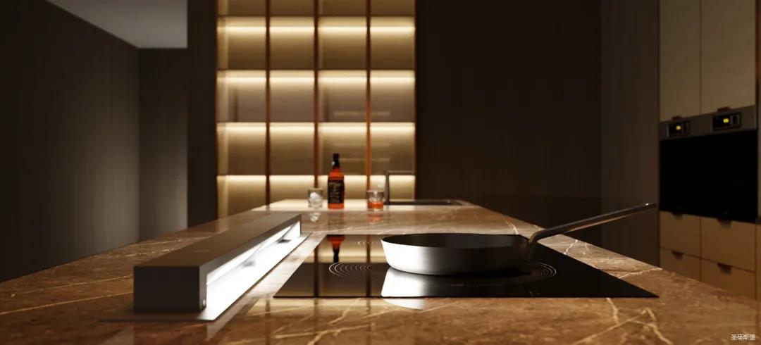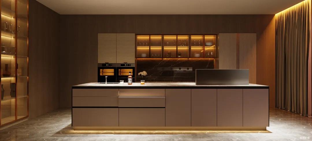 餐廚的極簡也可兼具多元,以一字內嵌式展開的廚區(qū)收納柜,兼顧了從杯具、調料等廚用材料收納到廚電歸置動線功能處理。在展示區(qū)域,玻璃隔板組合實木定制柜的表現(xiàn)形式,更是提升了空間的明亮度與寬闊感。