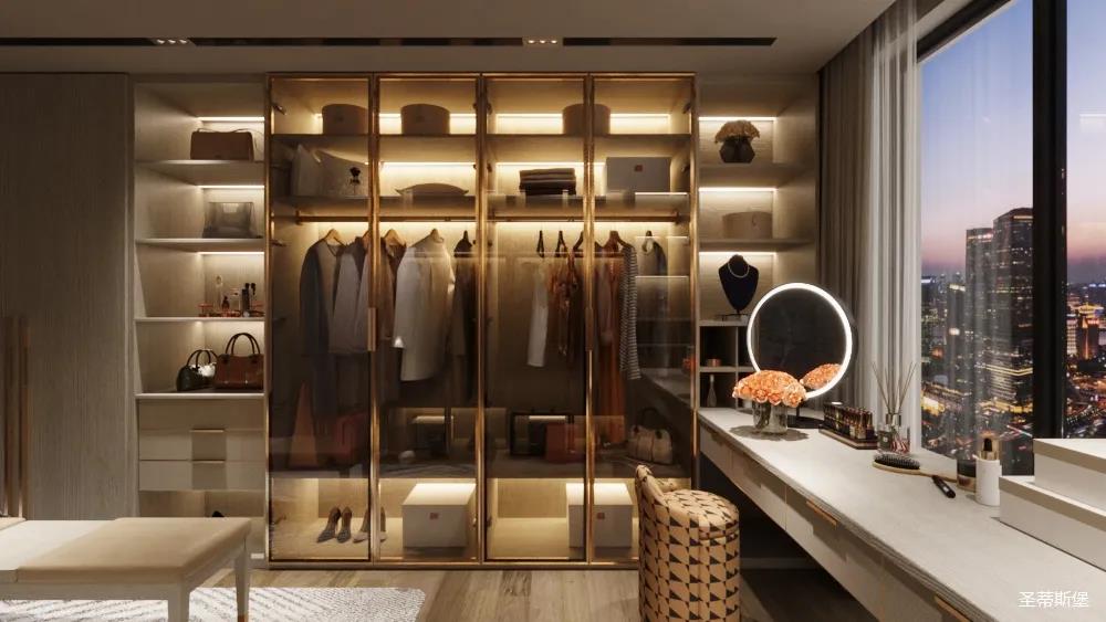移步衣帽間,精簡華麗幾乎貫穿了整個空間,質感高級的實木定制柜框架、通透明亮的玻璃展示區(qū)、色調醇厚的金屬鑲邊,每一項細節(jié)搭配都在強調著業(yè)主的高端品位。妝臺前的落地窗讓我們在觀賞都市繁華的同時也屏蔽了都市喧囂,讓我們置身于繁華都市中有一處寧靜休憩地。