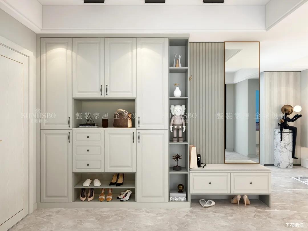 入戶(hù)側(cè)面設(shè)計(jì)一字型玄關(guān),腰部,底部留空做層板,便于隨手放置鑰匙、鞋包等物品,中間留空設(shè)計(jì)為開(kāi)放展示區(qū),加上軟裝飾品點(diǎn)綴,達(dá)到業(yè)主對(duì)品質(zhì)生活追求的理想狀態(tài)。應(yīng)女主人要求,玄關(guān)還加長(zhǎng)延伸出妝鏡和換鞋凳,讓動(dòng)線(xiàn)自然流暢。