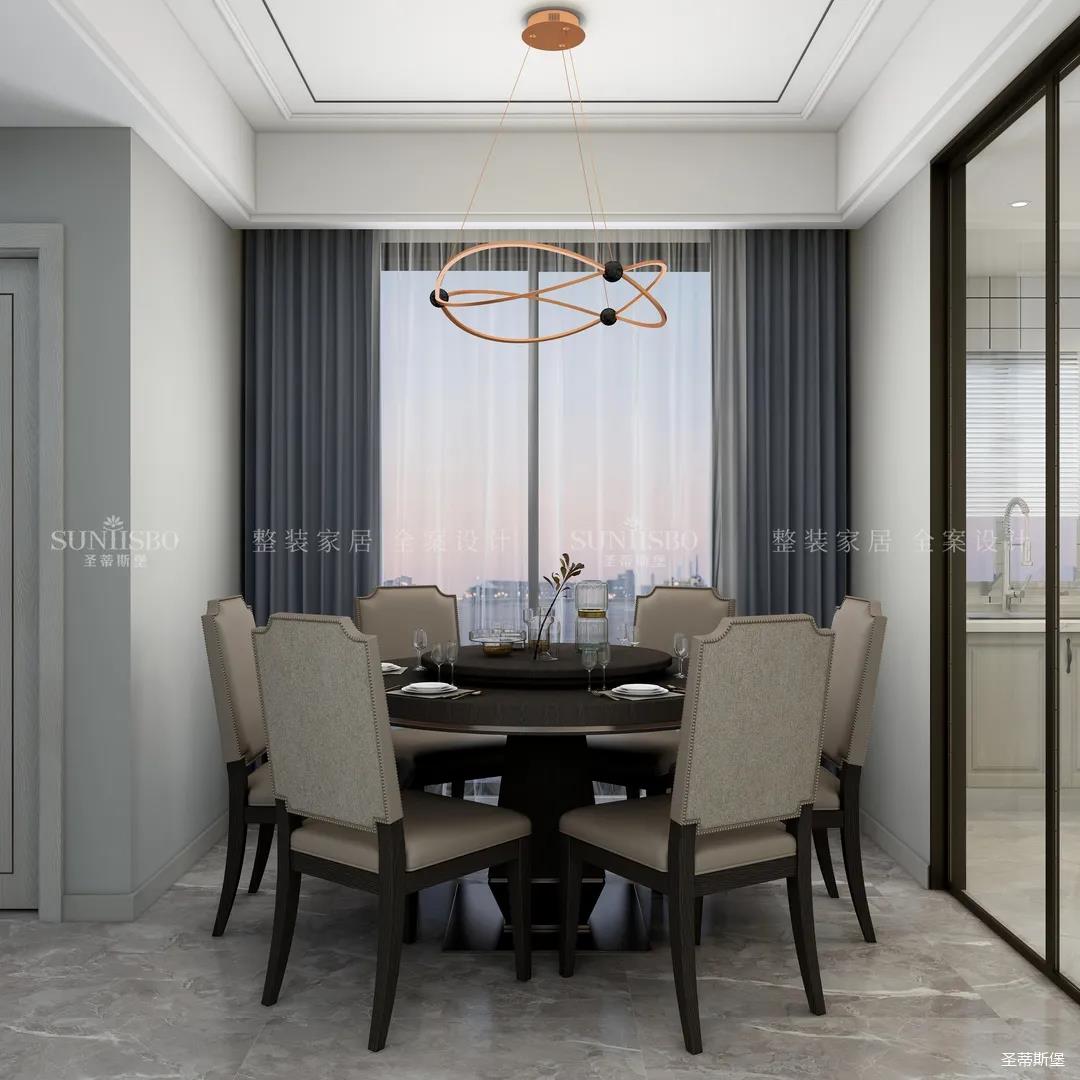 餐廳空間由于戶(hù)型空間有限,僅用淺色的護(hù)墻與深色的餐桌椅,在視覺(jué)上加深空間的縱深感,打造了滿(mǎn)足用餐、會(huì)客、社交的多重需求空間,把業(yè)主對(duì)一家人圍桌用餐的憧憬變成可落地居家場(chǎng)景。