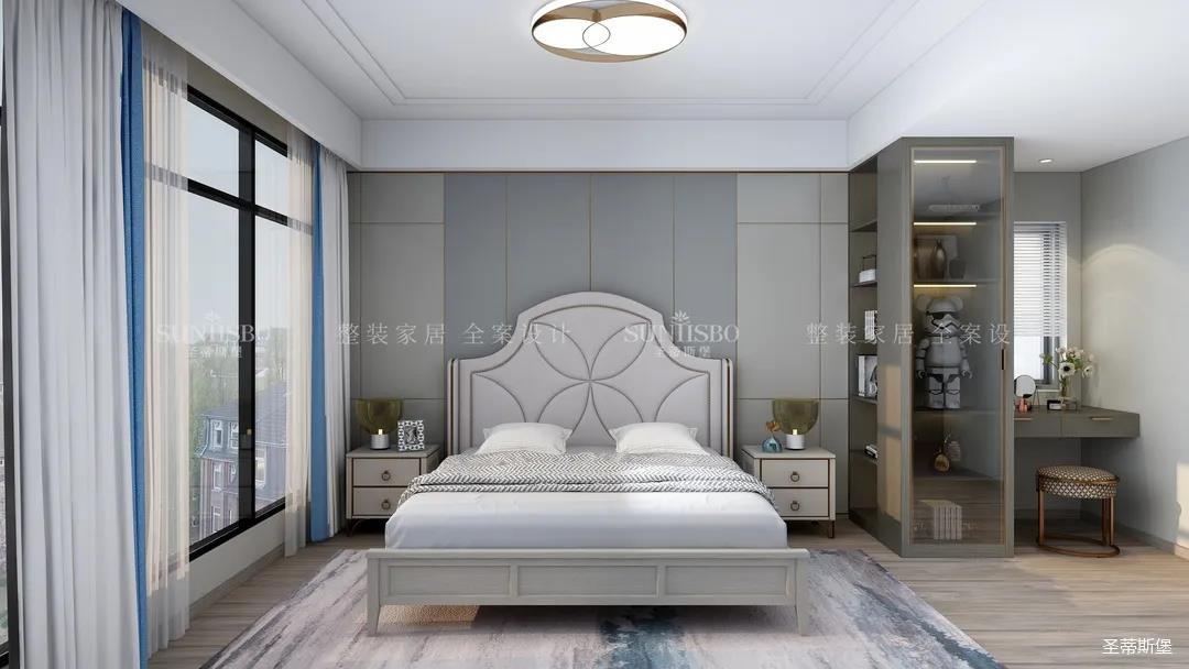 主臥的設(shè)計,整體風(fēng)格與色調(diào)的一致,通過空間設(shè)計與軟裝細(xì)節(jié)的調(diào)控,顯得主臥多了一份寧靜與放松。四照花床屏的細(xì)節(jié)、材質(zhì)色彩的把握、隔斷小書桌的設(shè)計,無不體現(xiàn)著設(shè)計師獨特的品位和全案設(shè)計的能力。