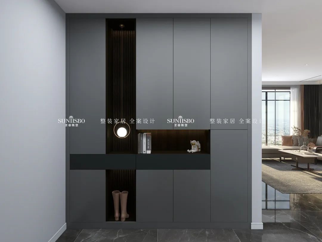 入口玄關(guān)處講究極致簡(jiǎn)潔,摒棄繁雜的設(shè)計(jì)元素,地面磚體采用與柜體相近的色調(diào),在界面轉(zhuǎn)折的地方著重連貫統(tǒng)一,讓入戶空間呈現(xiàn)科技立體感,趣味十足的藝術(shù)品擺放,使整體顯得高級(jí)又有顏值。在其中通過(guò)點(diǎn)狀燈光設(shè)計(jì),帶來(lái)躍動(dòng)而富有生命力的視覺(jué)焦點(diǎn),展現(xiàn)出現(xiàn)代時(shí)尚感。