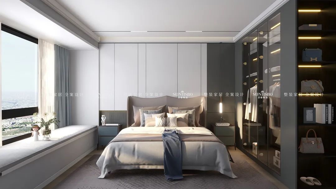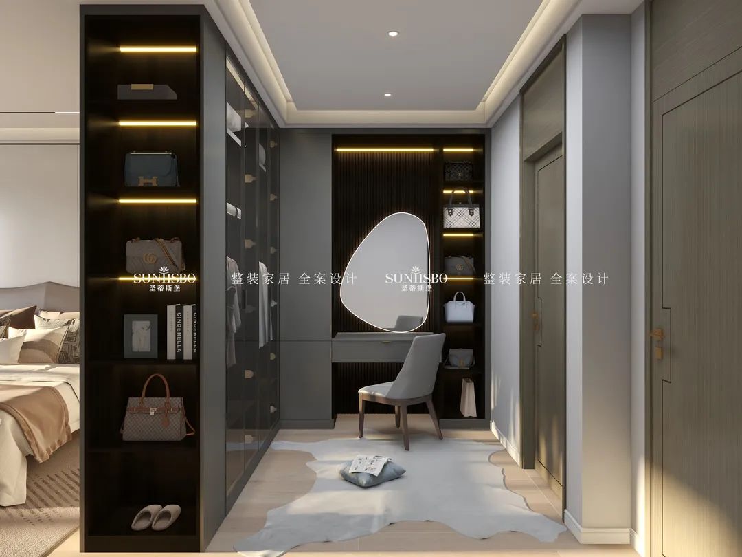 擁有一個(gè)專屬衣帽間是很多女生的夢(mèng)想。設(shè)計(jì)師回歸生活本質(zhì),究其外,是空間;究其內(nèi),是材質(zhì)、燈光,內(nèi)外融合,比例和諧。通過(guò)不規(guī)則狀的玻璃鏡面設(shè)計(jì),在時(shí)尚高級(jí)的定制空間中,傾訴著創(chuàng)意的真實(shí)和溫度,不僅擴(kuò)大了衣帽間視覺(jué)范圍,同時(shí)也給予了空間個(gè)性鮮明的藝術(shù)格調(diào)。